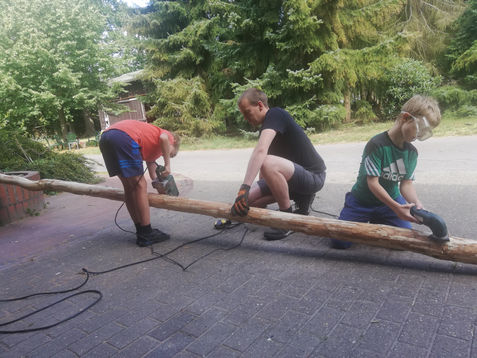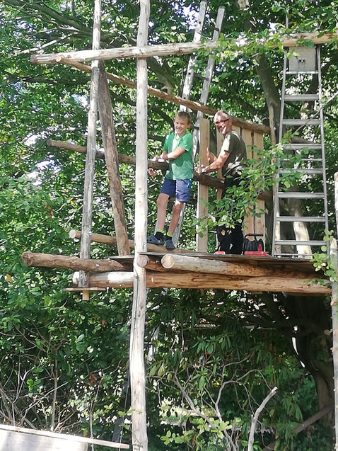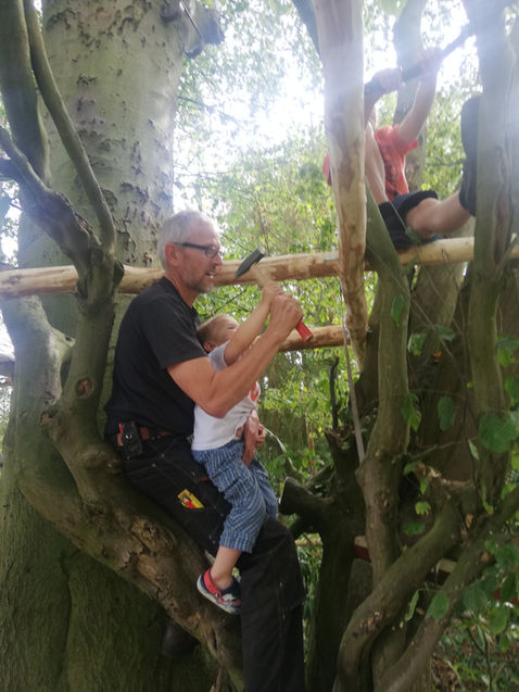 Viele kleine Kinderhände arbeiten mit fachlicher Unterstützung von Werner an einem Baumhaus. Dieser Bereich soll für ältere Kinder bestimmt sein, die sich ihren Spielplatz selbst „erarbeiten“ und sich handwerklich austoben wollen. Wie sonst soll der Fachkräftemangel in Zukunft beherrscht werden? :-) Und so entsteht Stück für Stück ein richtig tolles rustikales Baumhaus, das sogar an den dunklen Winterabenden beleuchtet werden kann. Wir sind gespannt, wer in diesem Jahr noch seinen Weg hierher findet und mitgestaltet.